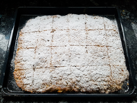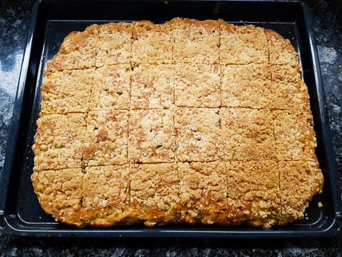 - Kuchen aus dem Blech nehmen, in Quadrate schneiden.