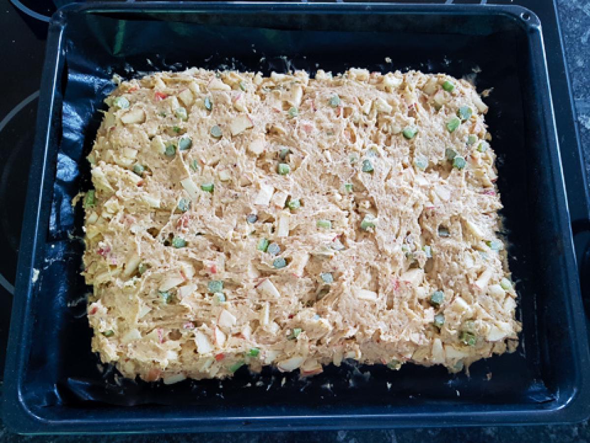- Teig ins vorbereitete Blech geben, glatt streichen.